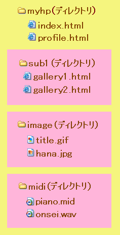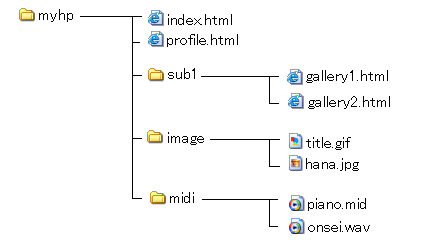 ホームページを作るにあたって、様々な場合に html ファイルや画像ファイル、midi ファイルなどの住所の書き込みが必要になってきます。郵便の宛先が日本国内であれば、あえて日本と書かなくていいように、ホームページも同じパソコンや、同じサーバーの中ならば、http://〜 と書かないで済みます。 例えばHPを作るために下図のように、myhp というディレクトリ(フォルダのこと)※ を作り、その中に index.html と profile.html を置き、画像と音楽ファイルを入れるための image、mid ディレクトリを作り、それぞれに画像・音楽ファイルを収納。gallery ファイルを入れるために Sub1 ディレクトリも作り、その中に gallery1.html と gallery2.html を入れたとします。 |