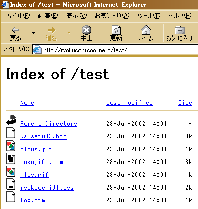 ホームページを作り始めた方の中に、「なんでトップページのファイルの名前を index.html(もしくは、index.htm)にしなければいけないのかな〜」と思っている方もおられると思います。別に index.html でなく top.html でもいいのです。しかし、index.html にすると、http://www.**.ne.jp/~***/ のURLで開いた時に、まずそのページが自動的に開かれます。URLの紹介欄に、http://www.**.ne.jp/~***/index.html と書いておられる方もいますが、index.html は書かなくても index.html が開きます。これはサーバーの設定でそのようにされているからです。プロバイターやレンタルサーバなどの設定は、必ずしも同じではなく、htm、html どちらも開く設定になっているところもあれば、html なら開くけれど、htm だと開かないなんてところもあります。 index.html (htm) が入っていないディレクトリに、ディレクトリ名だけでアクセスすると、 Forbidden、Access Denied このディレクトリ内のファイル閲覧は禁止されています といった内容のページが出るところが多いです。 サンプル たまにディレクトリのインデックス表示を許可しているサーバがありますが、そういうところでは、下図のようなページが表示されます。 サンプル ![]() ■ホームページアドレス(URL)