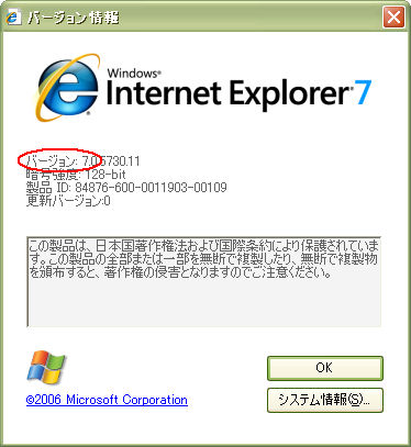 2006年夏までは、インターネット・エクスプローラーの最新バージョンは6でした。夏までインターネット・エクスプローラーのバージョン7のベータ版(お試し版)が公開されていましたが、秋に正式なバージョン7として公開されました。とはいっても 2006年末現在、多く方のインターネット・エクスプローラーのバージョンは未だ6だと思われます。確かにフィッシング詐欺対策や、RSSフィーダ(RDF Site Summary あるいは Rich Site Summary の略で、サイト内の新着情報などが書かれています)を簡単に見ることができるようになっていますが、タブ式などに慣れなていない方たちにはちょっと使い勝手が悪いかなとも思われます。わたしは6の方は、今のところ無理をして7にしなくてもいいと思っています。 |
