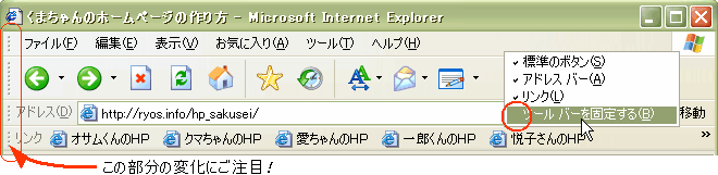 があります。ツール・バー上で右クリックをし、出て来たメニューの [ツールバーを固定する(B)] にチェックがついていたら、それを外すことによって、各バーの表示位置を変えることができます。