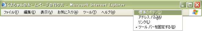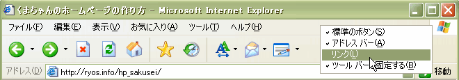 また、このメニューの中の、それぞれのバーをチェックしたり、チェックを外すことによって、各バーを表示させたり、させなかったりできます。ただし、メニュー・バーだけは消すことはできません。ではリンクから消してみましょう。