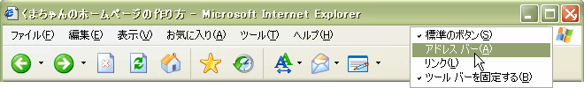 ここでちょっとした落とし穴があります。[ツールバーを固定する(B)] のチェックを外し、移動したいバーをドラッグすることによって、バーの位置を移動できることを知らない場合、アドレス・バーが下のようになっている状態でツールバーが固定されていると、アドレス・バーが表示されていてもアドレス入力欄が表示されずに使えないということになります。そんな人、いませんか?。