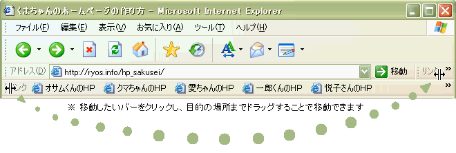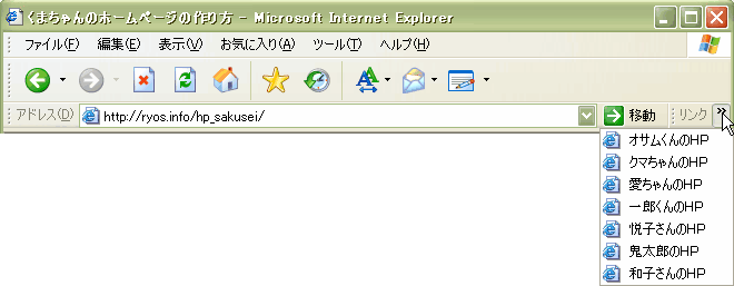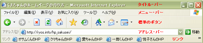 タイトル・バー、メニュー・バー、標準のボタン、アドレス・バー、リンク