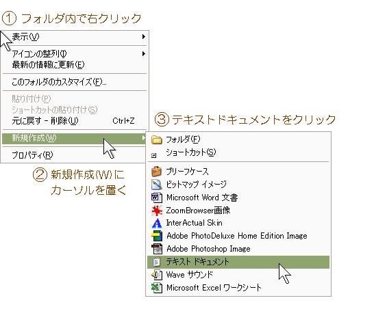 次に、ホームページ用のフォルダを開き、さっきと同じように白い部分にカーソルを置いて右クリックしてください。で、出てきたメニューの中の [ 新規作成(W) ] の上にカーソルを置いて待っていると、もうひとつメニューが出てくるから。今度はその中の [ テキストドキュメント ] をクリックします。
