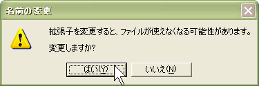 で、index.html と書き入れてフォルダの内の白い部分をクリックすると、下のような問いかけのダイアログボックスが出てくるんだ。でもこれは [ はい ] をクリックして大丈夫だよ。