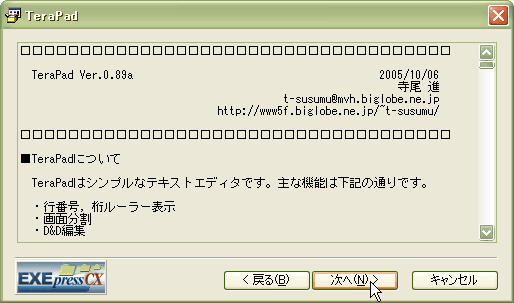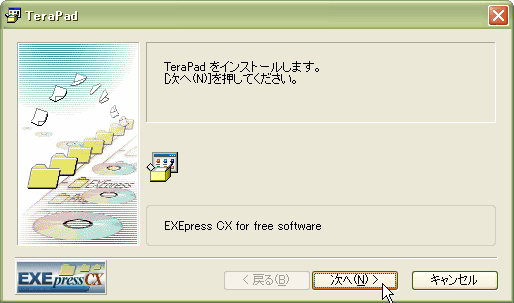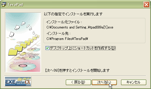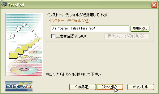 ※ ここは必ずこのまま "次へ" をクリックしてください。ここでインストール先を変えてしまいますと、次にご紹介します TeraPad をクリックひとつで ソースエディター にする terapad.reg ファイルが使えなくなってしまいます。