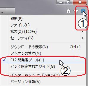 まず、インターネット・エクスプローラー9画面右上端の ツールのアイコン(歯車の形)をクリック。次に F12開発者ツール(L) をクリック。F12 とあるので、ファンクションキーの F12 を押しても同じ結果になります。