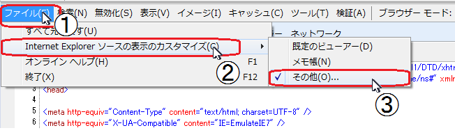 開発者ツール の画面が、インターネット・エクスプローラー9画面下部に出てきます。ファイル → Internet Explorer ソースの表示のカスタマイズ → その他 の順にクリック。