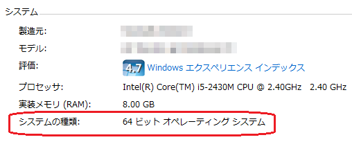 ご自分のパソコンが32bitか、64bitか調べるには、パソコンの(マイ)コンピューター上で右クリックし、プロパティをクリックすると、システムの種類というところに 32 か 64 のビット数が書かれています。