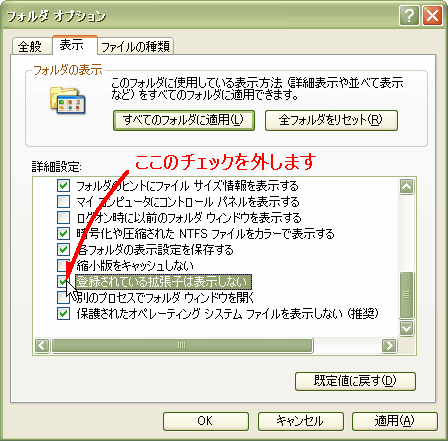 コンピューター購入時の初期設定では拡張子が表示されない設定になっている方が多いようです。[スタート] → [コントロールパネル] → [デスクトップの表示とテーマ] の順に開き、フォルダオプションのアイコンをクリックしますと、下図のような設定画面が出ます。コントロールパネルをクラッシック表示している方は、たくさんのアイコンの中からフォルダオプションのアイコンを探してクリックしてください。表示の項を開き図のように「登録されているファイルの拡張子は表示しない」の項目についている「 v 」チェックマークを外します。 |