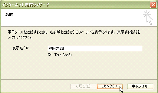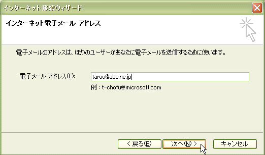 次は、プロバイダーから頂いたメールアドレスを入力して [次へ] をクリックします。