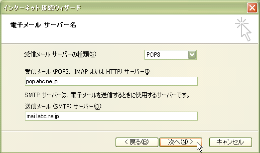 次は、プロバイダーのメールサーバの情報を入力します。受信メールの種類は、プロバイダーから頂いた資料の中に書いてありますが、POP3 の場合がほとんどです。受信メールサーバ、送信メールサーバの名前(アドレス)も、プロバイダーから頂いた資料の中に書いてありますので、それを入力して [次へ] をクリックします。