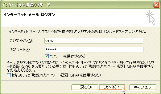 次はアカウント名(プロバイダーから頂いた資料には、ユーザー名とか、ユーザーIDと書かれている場合もあります)とメールパスワードの入力です。