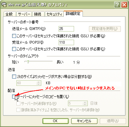 パソコンを複数台使っている場合は、どれか一台のパソコンで、メール受信時にサーバにメッセージのコピーを置かないように設定します。そうしないと、サーバのメールボックスが受信メールで一杯になり、メールの受信ができなくなるからです。