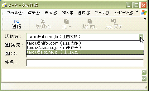 メール・アカウントを複数設定すると、下図のようにメールの新規作成時に送信者欄が表示され、送信者を選択できるようになります。