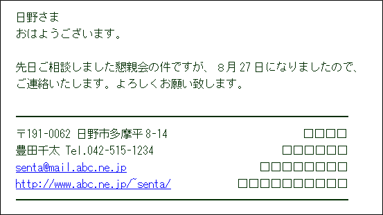 メール本文の最後に、下記のように自分の署名を入れてみましょう。