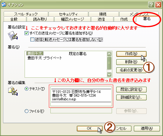 出てきたオプションの [署名] の設定画面で、自分の署名を予め作っておくことができます。用途に合わせて複数作ることもできます。よく使う署名は、規定にしておくと署名メニューの一番上に規定として表示されます。