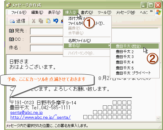 メール作成時に、本文の署名を入れたい所にカーソルを置いてクリックします。