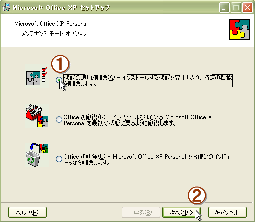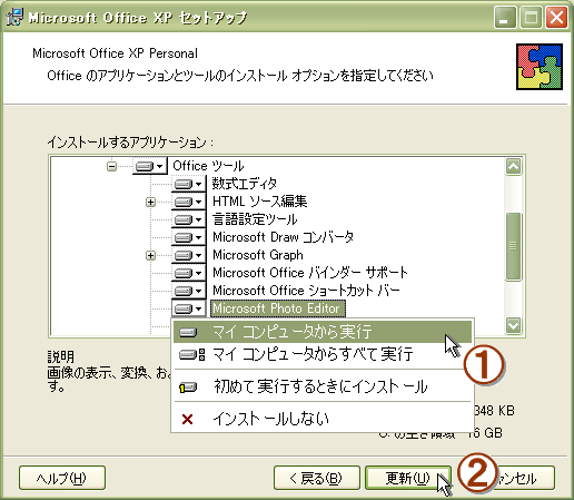 ![]() 4. [Microsoft Office XP セットアップ(メンテナンスモードオプション)] という ![]() 5. [Officeツール] から追加できる機能が一覧表示されますので、 ![]() 6. 出て来たメニューの中から [マイコンピュータから実行] を選択し、 ![]() |