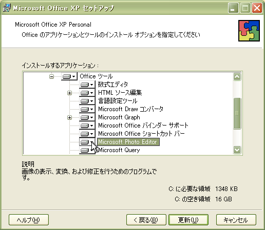 MS Photo Editor は Microsoft Office XP のツールソフトとして付属しているソフトです。Microsoft Office 2003 からは、Photo Editor に代わって Picture Manager という別の画像編集ソフトが付属していまので、2003年以降に Windows XP を買われて、Office ソフトが Office 2003 だったパソコンにはインストールできません。 |