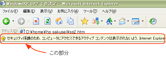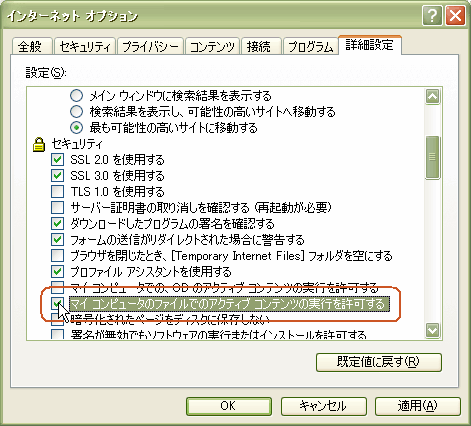 WindowsXP のパソコンを使われている方で、SP2 をインストールしてる方、また購入した時点で既に SP2 がインストールされていた方は、自分のパソコン内で html ファイルを編集している時に、そのソースの中に JavaScript などのプログラムが含まれていますと、下図のような 情報バー と呼ばれるバーが出て来ます。![]() ホームページ作成中に、一々このようなバーが出て来ては不愉快ですし、JavaScript などのプログラムの動作をブロックしてしまいますので、プログラム動作の確認もできません。設定によりこのバーを出なくし、プログラムも動作するようにしましょう。 ※ ただし情報バーの機能は、メールの添付ファイルなどを開いた時に、悪意のあるプログラムが動作したりすることをブロックするための機能ですので、心配な方はそのままにしておいてください。万が一、この機能を解除したことによって何らかの被害を受けられたとしても、当サイトは一切の責任を負うことはできません。インターネット・エクスプローラーのメニューバーの [ ツール(T) ] → [ インターネット オプション(O) ] の順にクリックし、インターネット・オプションのダイアログボックスが出て来ましたら、[ 詳細設定 ] のタブをクリックします。そしてその設定項目のセキュリティー中の、[ マイ コンピューターのファイルでアクティブ コンテンツの実行を許可する ] にチェックを入れて、[ 適用(A) ] → [ OK ] をクリックしてあげます。 ![]() これであの目障りな 情報バー は出なくなりますし、ページに書かれたプログラムも動作するようになります。(^^;) |