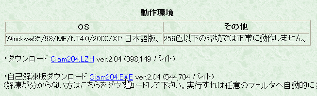 ページの下の方に、下図の部分がありますので、自己解凍版ダウンロード Giam204.EXE ver.2.04リンク部分をクリックします。