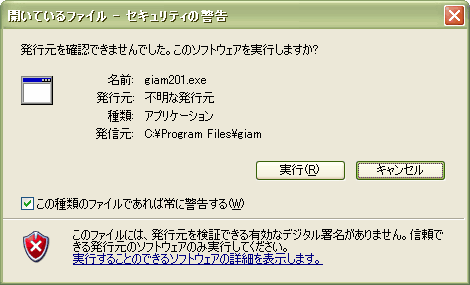 ダウンロードの完了がでましたら、Cディスク、Program Files 、giam を開き、中に保存された giam204.exe をダブルクリックして開きます。