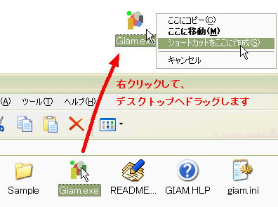 プログラムを起動しやすいように、Cディスク、Program Files 、giam の中にできました Giam.exe のショートカットアイコンを、下図のようにしてデスクトップに作っておきましょう。
