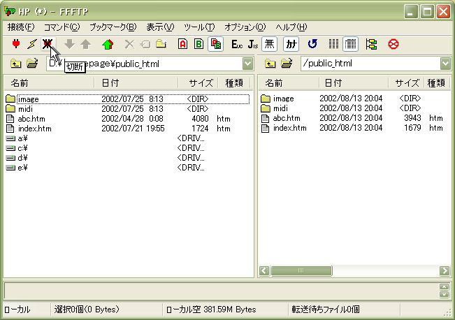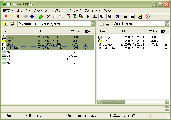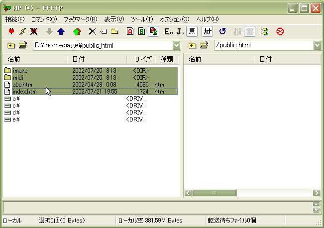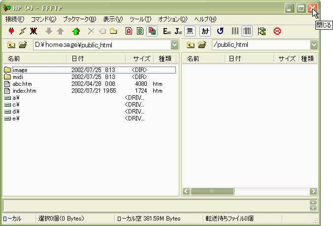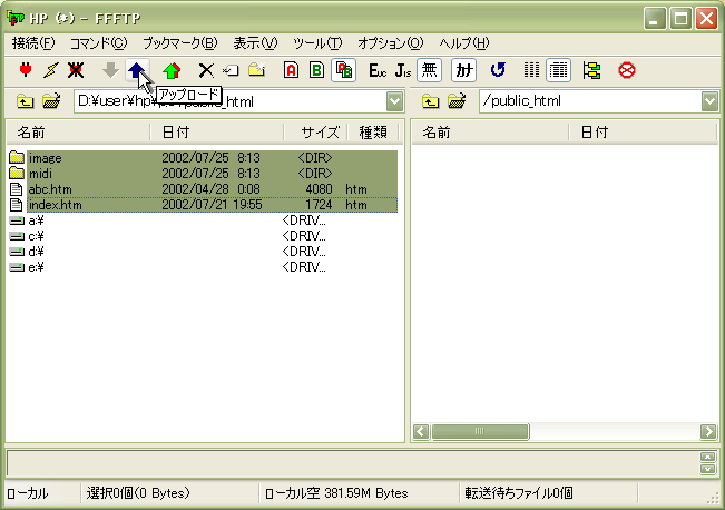 さて、では作ったホームページのファイルやフォルダをサーバーの自分のディレクトリにアップロードしてみましょう。よくホームページに関するページに、ディレクトリという言葉が出てきますが、難しく考えることはないです。サーバーのように UNIX を OS とするコンピューターでは、わたしたちのコンピューター( Windows や Macintosh )でフォルダと呼んでいる部分をディレクトリと呼んでいるのです。