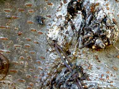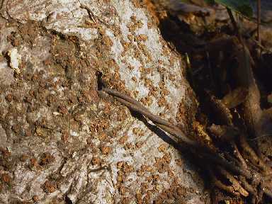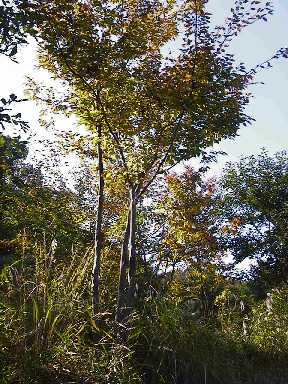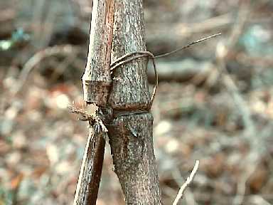 添え木を外すとともに、樹木にたくさん絡んだつる性の植物を取り 除いたり、横に張り出した枝など剪定しました。また何本も生え出し ているクサギの幼木なども伐採しました。東光寺緑地で一番大きいと みられる大ケヤキが2年ほど前の萌芽更新の際に伐採されましたが、 この大ケヤキは過去に何回か伐採されたらしく、根元が異様に大きく なっていて、その中は空洞になっていました。幸い今回の伐採にもめ げずにたくさんの萌芽枝を伸ばしていましたので、皆で不要な萌芽枝 を剪定してあげたのですが、その時に驚いたことがありました。なん とこの大きな切り株のいたるところから有刺鉄線が飛び出していまし た。ケヤキのたくましさにも感心させられましたが、どういう経緯で こんなことになったのか考えてさせられてしまいました。 |